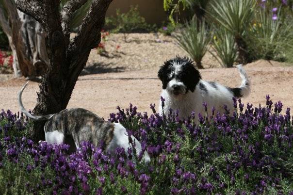 Oliver and Tillie looking for frogs in the lavender garden